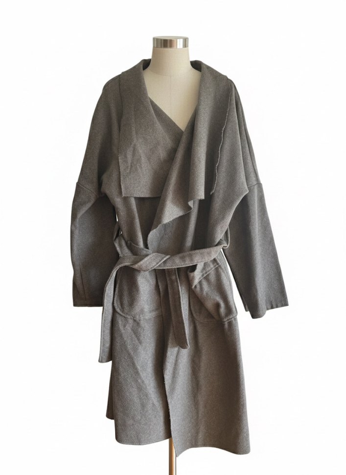 Gri renkte, uzun kollu ve bol kesim kadın ince kaban, kuşaklı ve cepli tasarıma sahiptir. Rahat ve desen içermeyen modeldir. ️