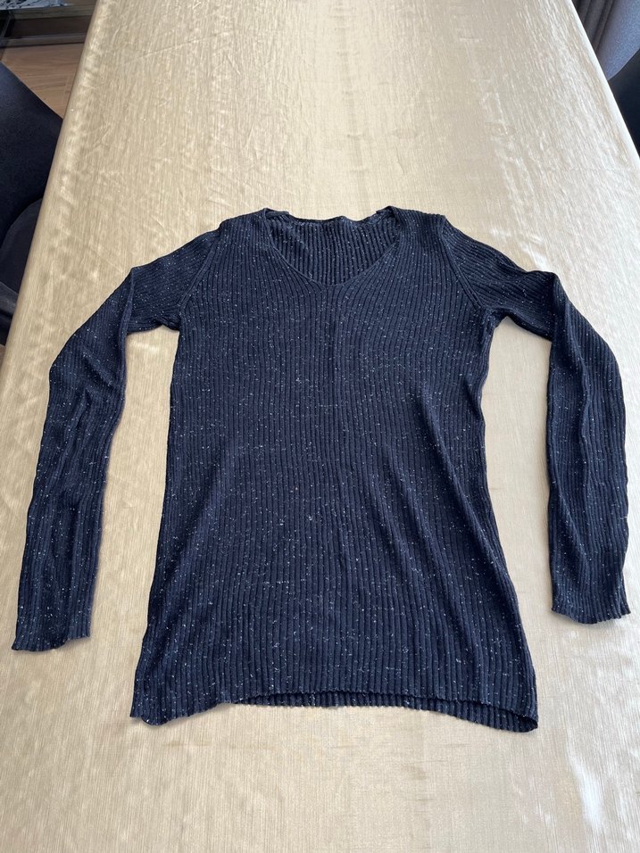 Gri renkli, uzun kollu ve yuvarlak yakalı kazak, bol kesim ve normal boyda, rahat günlük kullanım için uygundur.
