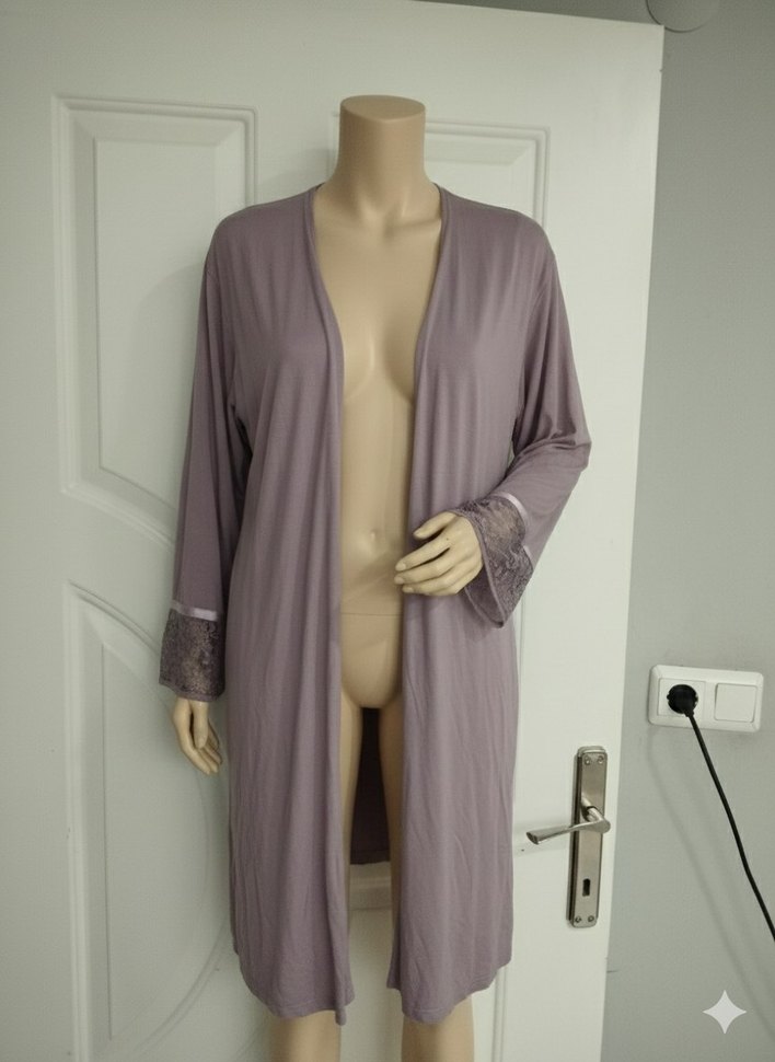Gri renkte, uzun kollu ve dantel detaylı manşetlere sahip uzun, bol kesim kadın sabahlığıdır. Rahat ve çağdaş bir tarza sahiptir.