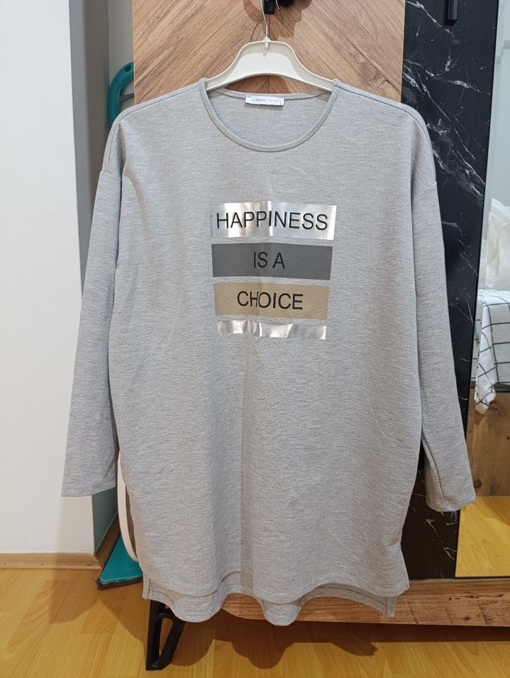 Gri renkli, uzun kollu, yuvarlak yakalı ve pamuklu kumaştan üretilmiş bol kesim sweatshirt. Üzerinde motivasyonel baskı bulunur, günlük kullanıma uygundur.