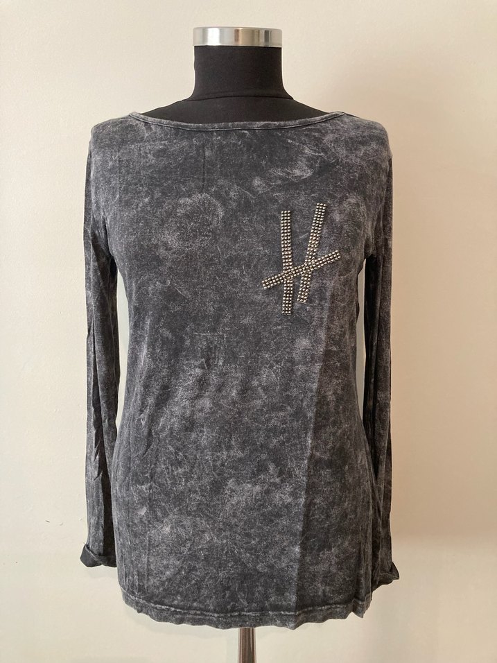 Gri, uzun kollu kadın tişörtü, yuvarlak yaka ve bol kesime sahiptir. Yumuşak kumaştan üretilmiş, batik desenli ve taş işleme detayları ile gündelik kullanıma uygundur.