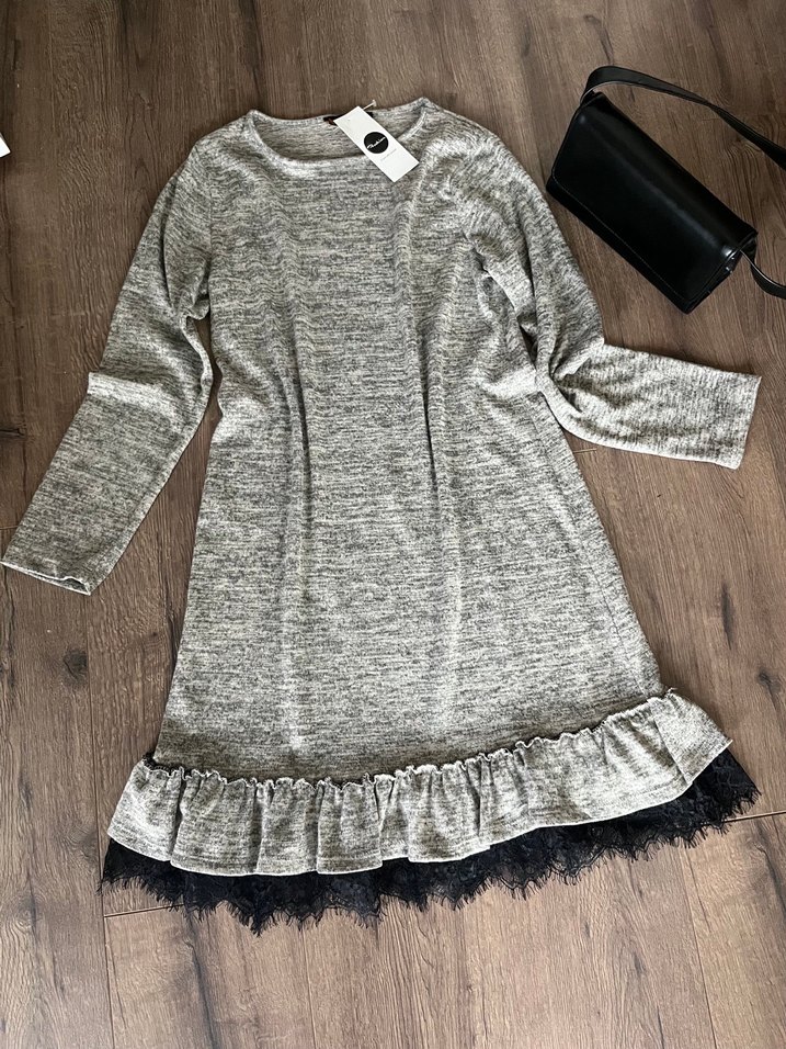 Yumuşak yün kumaştan uzun, bol kesim gri triko elbise. Uzun kollu ve bisiklet yaka, etek kısmında fırfır detaylı bohem tarzda rahat bir model.
