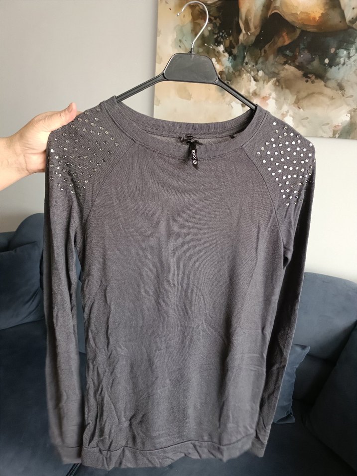 Gri renkli, pamuklu triko kazak, uzun kollu ve yuvarlak yakalıdır. Salaş kesimi ve omuzlardaki metal detaylarıyla günlük rahat şıklık sunar.