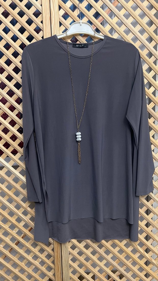 Uzun kollu, gri tunik. Salaş kesim ve ipeksi kumaş ile günlük rahat kullanım için uygundur. Ürün bir bedendir 36 ve 44 uyumludur