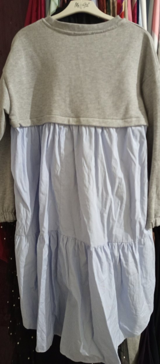 Gri renkte, uzun kollu ve yuvarlak yakalı, bol kesim tunik Alt kısmında fırfır detayı bulunan yumuşak keten kumaştan üretilmiştir. arka kısımda gömlek tarzı uzun seklindedir bedeni S ama Kalıp büyük