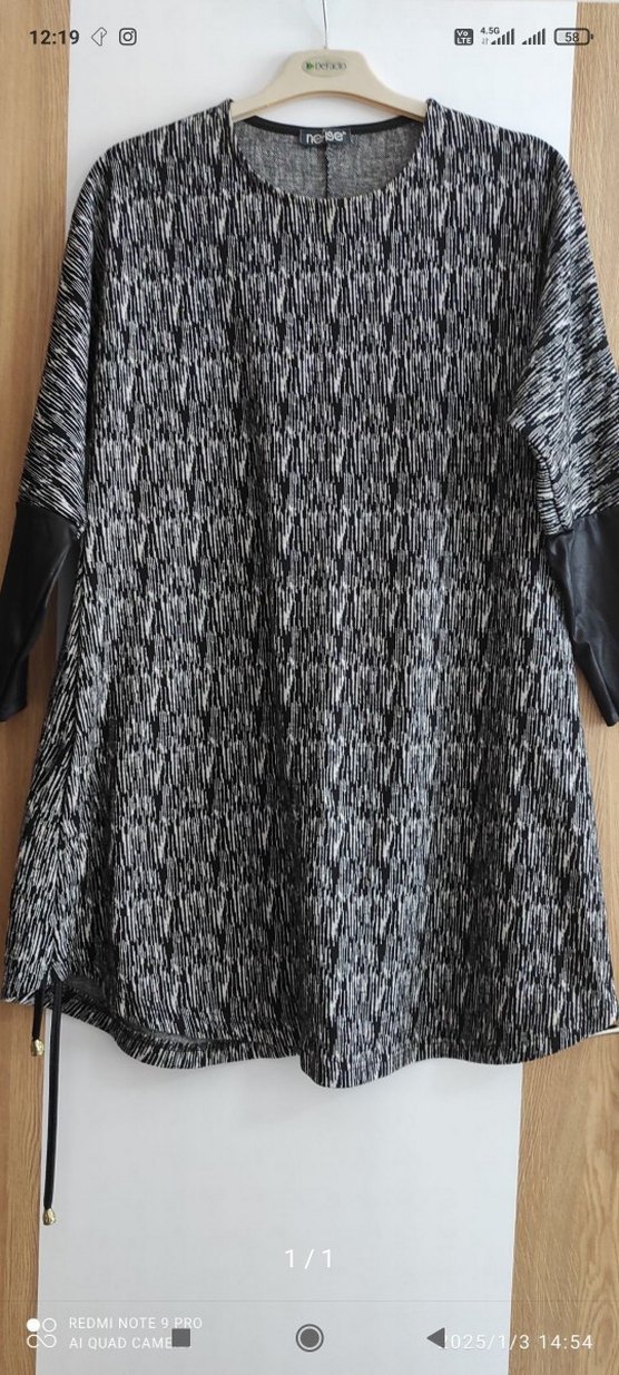Uzun kollu, yüksek yakalı ve kadın tunik. Gri renkte, yumuşak kumaştan kol uçları deri detayli günlük kullanım için uygundur.