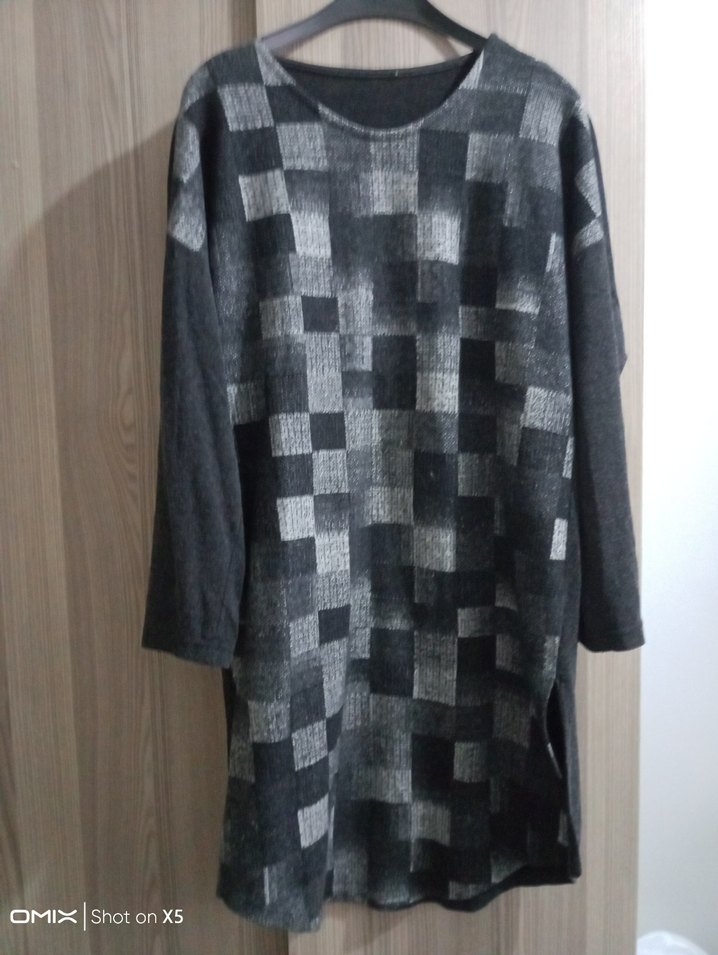 Gri renkli, uzun kollu, yuvarlak yaka ve dokulu kadın tunik. Midi boyu ve hafif kare desenleriyle rahat ve şık bir sokak stili sunar.