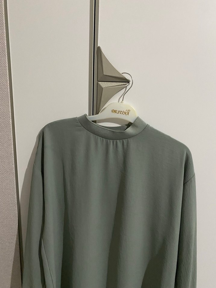 Gri renk, yuvarlak yaka ve uzun kollu kadın tunik. Sentetik kumaştan, bol kesim ve uzun boyda, gündelik kullanıma uygun sade tasarım.