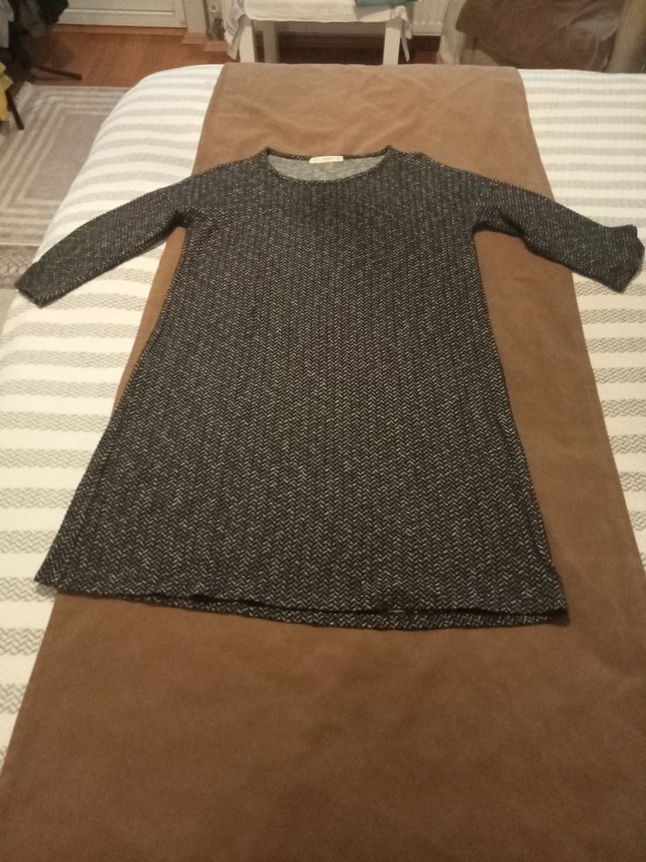 Gri renkte, uzun kollu ve yuvarlak yakalı bu penye elbise, rahat ve salaş kesimiyle günlük kullanıma uygundur.