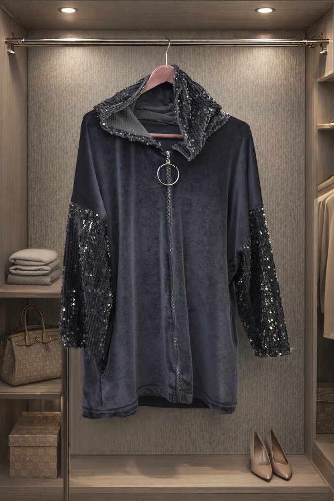 Gri renkte, yumuşak sentetik kumaştan, bol kesim uzun kollu kadın ceketi. Kapüşonlu ve kolları payet detaylıdır, rahat sokak stili için uygundur. ✨