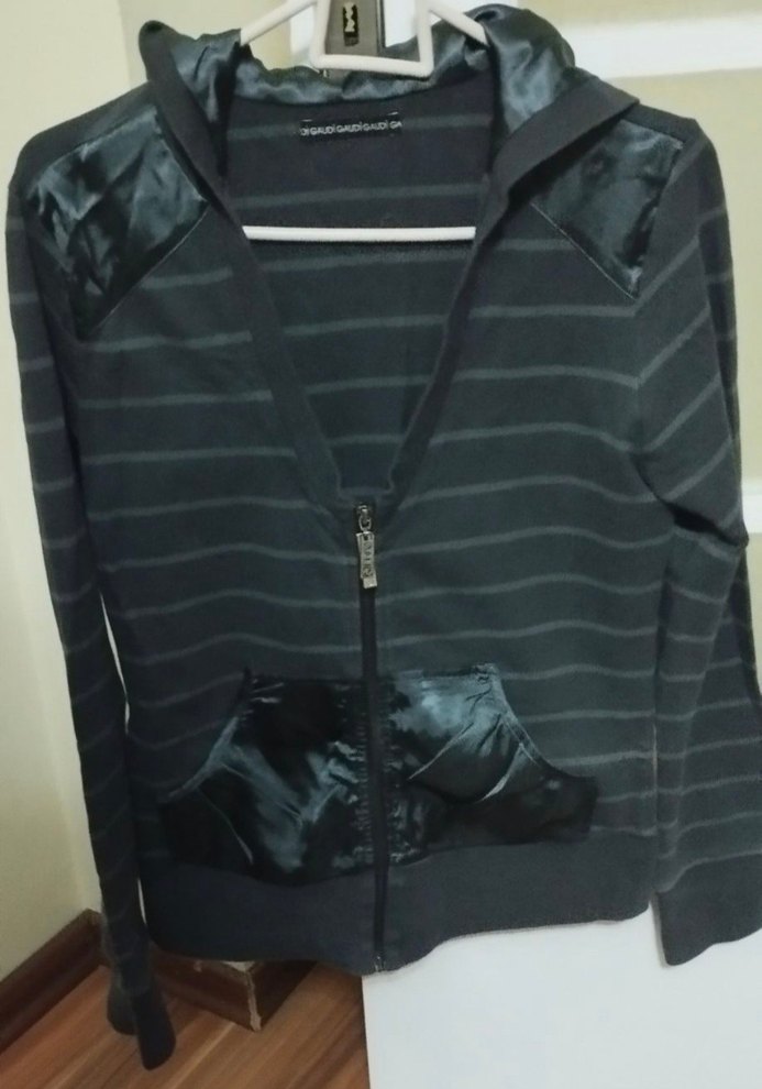 Kapüşonlu ve fermuarlı, koyu gri renk ve ince çizgili, gündelik kullanım için uygun. çok iyi durumda dirsekde incelme yok yıpranık değil az kullanıldı. omuz cep ve şapkanın içi fotoda da göründüğü üzere saten gibi ipek gibi kumaş detaylı ayrıca ürüne şıklık katıyor