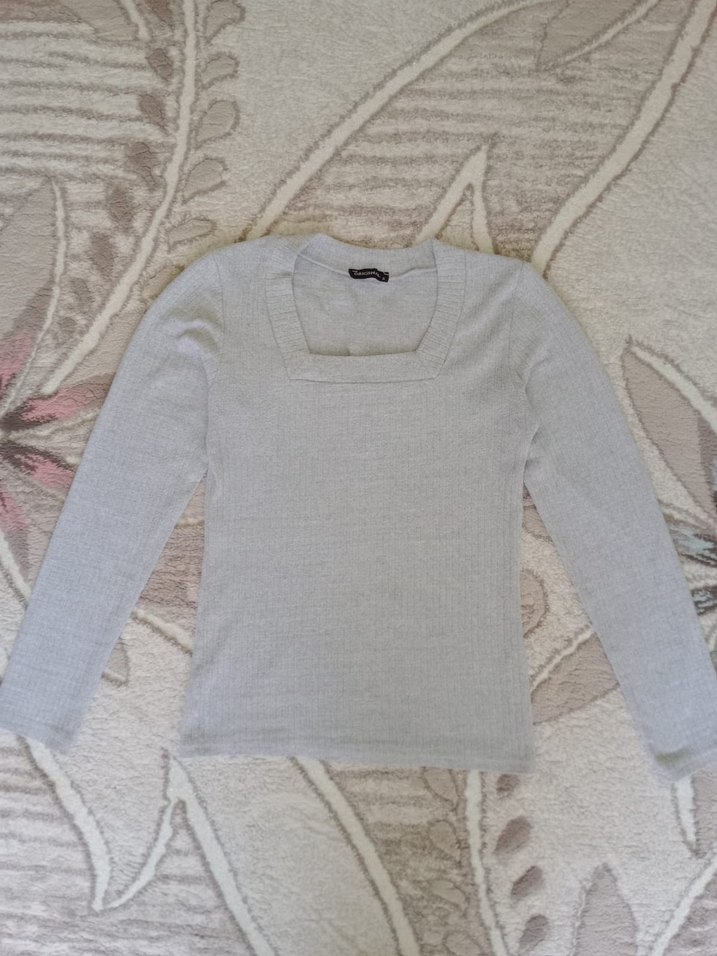 Fitted kesim, uzun kollu ve kare yaka kadın trikosudur. Yumuşak keten kumaştan örülmüş, sade gri renklidir, rahat kullanıma uygundur.
