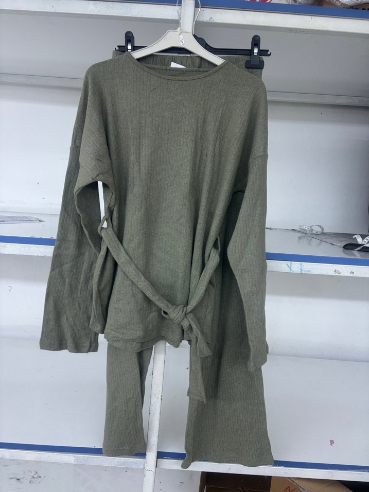 Gri renkte, uzun kollu ve kemerli, rahat kesim kadın triko. Yumuşak keten kumaştan yapılmış, günlük kullanıma uygun rahat ve şık bir parça.