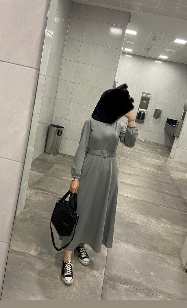 Gri Uzun Kollu Kemerli Salaş Elbise
