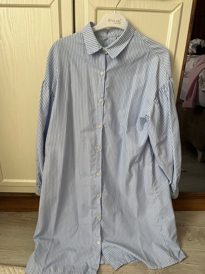 Gri keten kumaştan, düğmeli ve yakalı, uzun kollu, bol kesim midi gömlek. Kollarda çizgili detaylar bulunur, günlük kullanıma uygundur.
