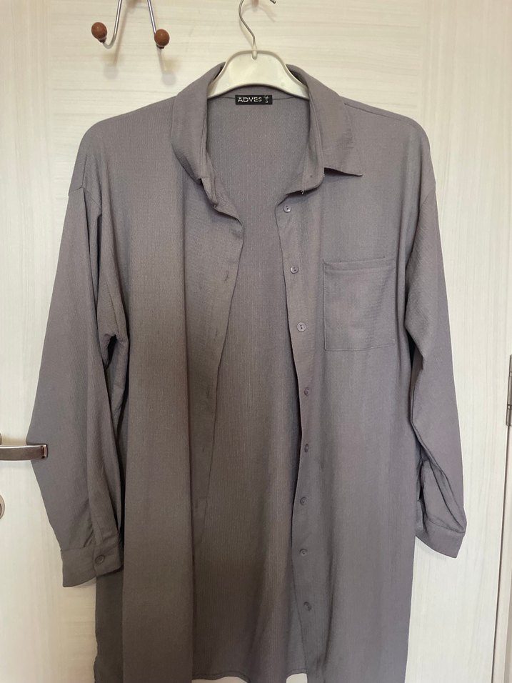 Gri uzun kollu keten gömlek, yakalı ve düğmeli, cep detaylıdır. Salaş kesimiyle günlük kullanım için uygundur.