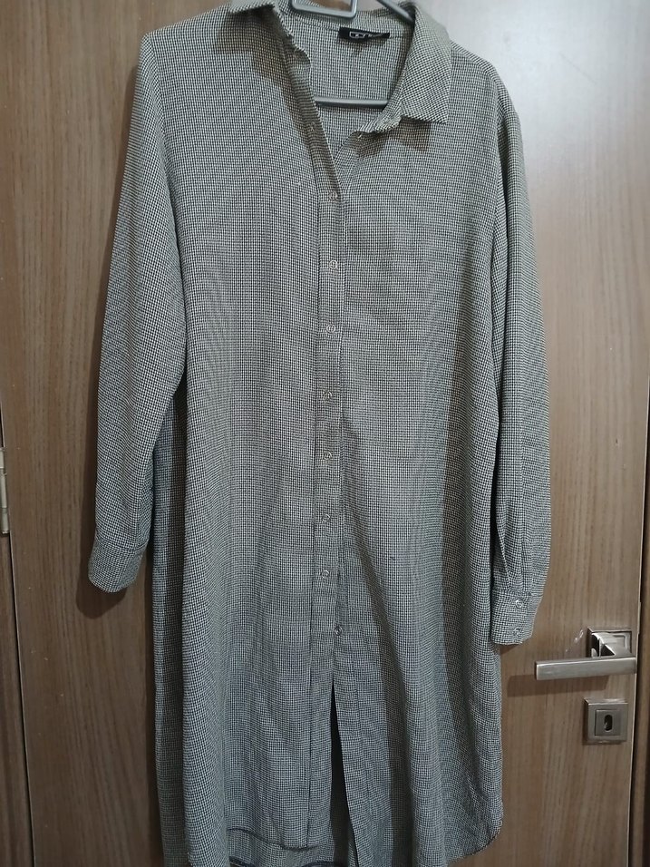 Gri renkte, uzun kollu ve düğmeli keten kadın gömleği. Yaka kısmı çentikli ve bol kesimdir, günlük sokak stiline uygundur.