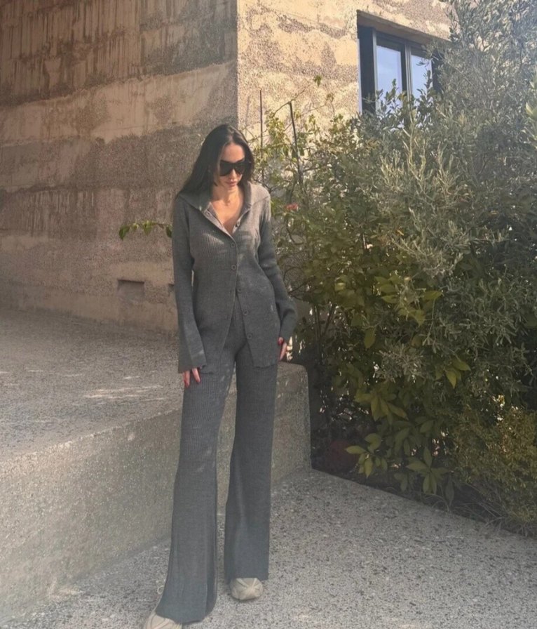 Gri triko kumaştan uzun ve regular fit kadın takımı, kesik yaka ve düz desensiz tasarımıyla rahat ve şık bir görünüm sunar.