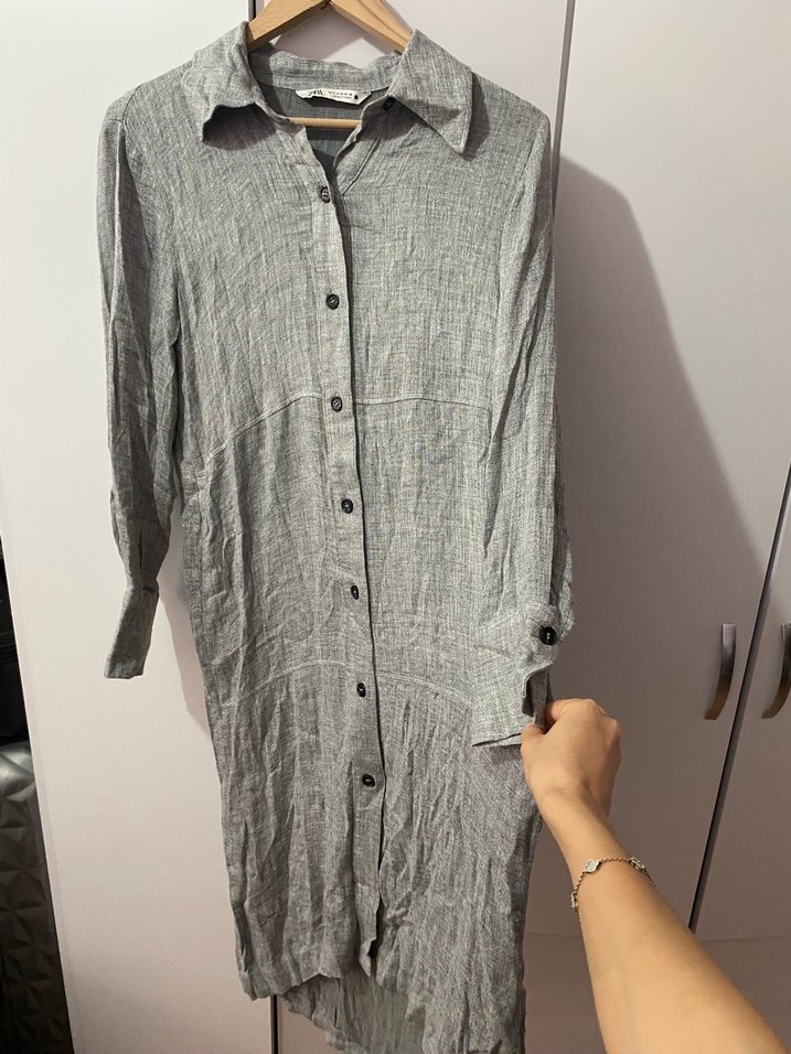 Gri keten kumaştan, düğmeli, yakalı ve uzun kollu midi uzunlukta, salaş kesim bir gömlek. Rahat ve günlük kullanıma uygun.