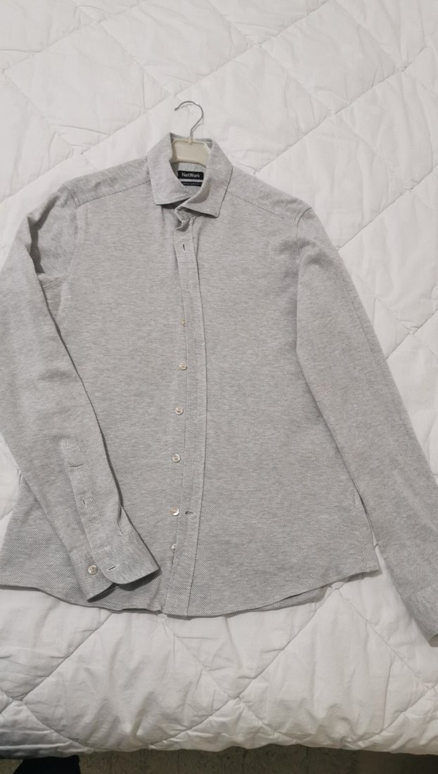 kumaştan, düğmeli ve yakalı gri uzun kollu erkek gömlek. Normal kesim ve desensiz, ofis kullanımı için uygun. Yüzde yüz pamuk