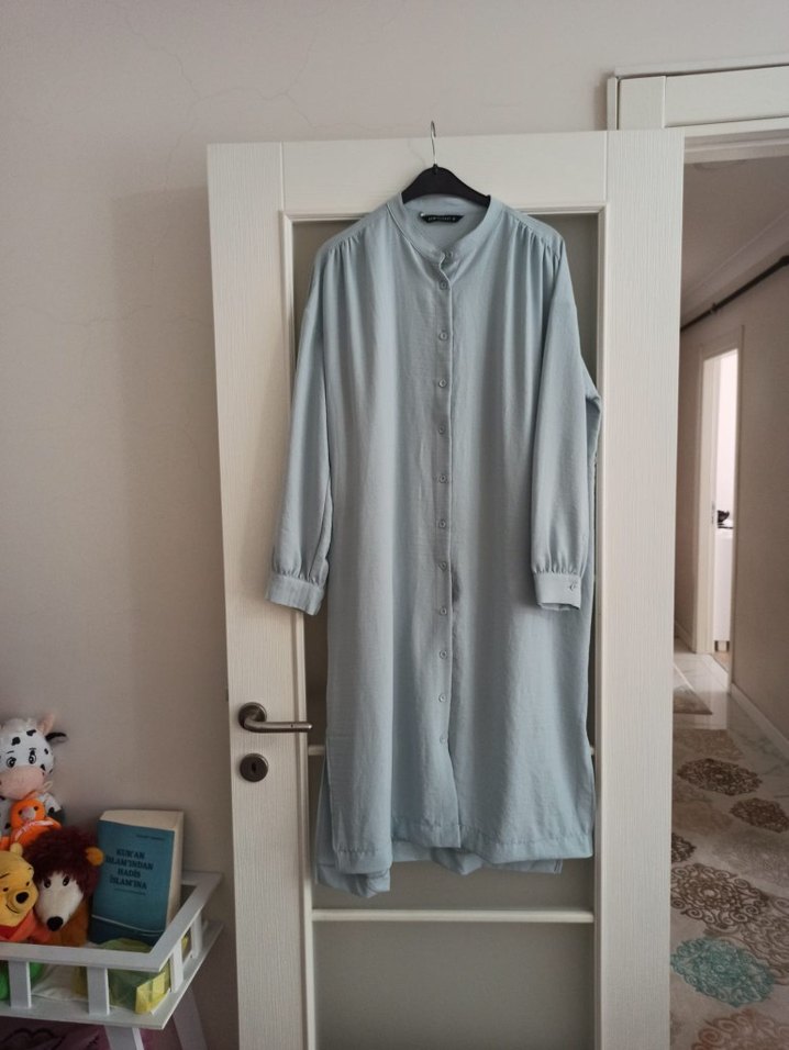Gri renkli, düğmeli ve yüksek yakalı uzun kollu keten tunik, bol kesimiyle günlük kullanıma uygun minimal bir tarz sunar.
