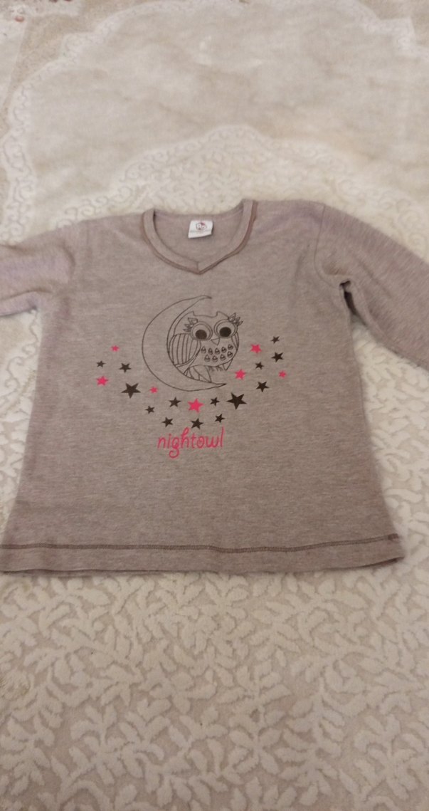 Gri, uzun kollu kız çocuk tişörtü, örme dokulu ve bol kesim. Yuvarlak yaka, önünde baykuş, yıldızlar ve 'nightowl' yazısı bulunur.