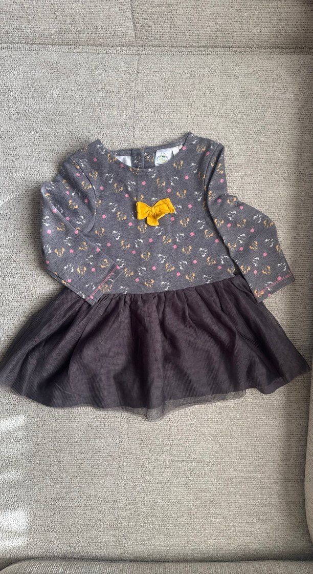 Gri baskılı üst kısmı, sarı fiyonk ve tütülü eteği olan uzun kollu