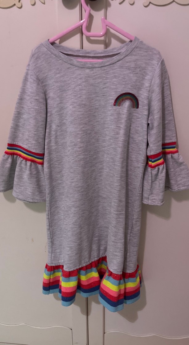 Gri renkli, uzun kollu ve salaş kesim kız elbisesidir. Yumuşak kumaştan üretilmiş, fırfırlı kolları ve gökkuşağı detayları bulunur.