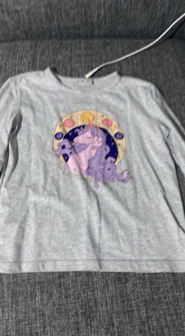 Gri uzun kollu kız tişörtü, rahat kesim ve önünde unicorn baskısı. Yumuşak kumaştan, yuvarlak yaka ve düğme detaylıdır.