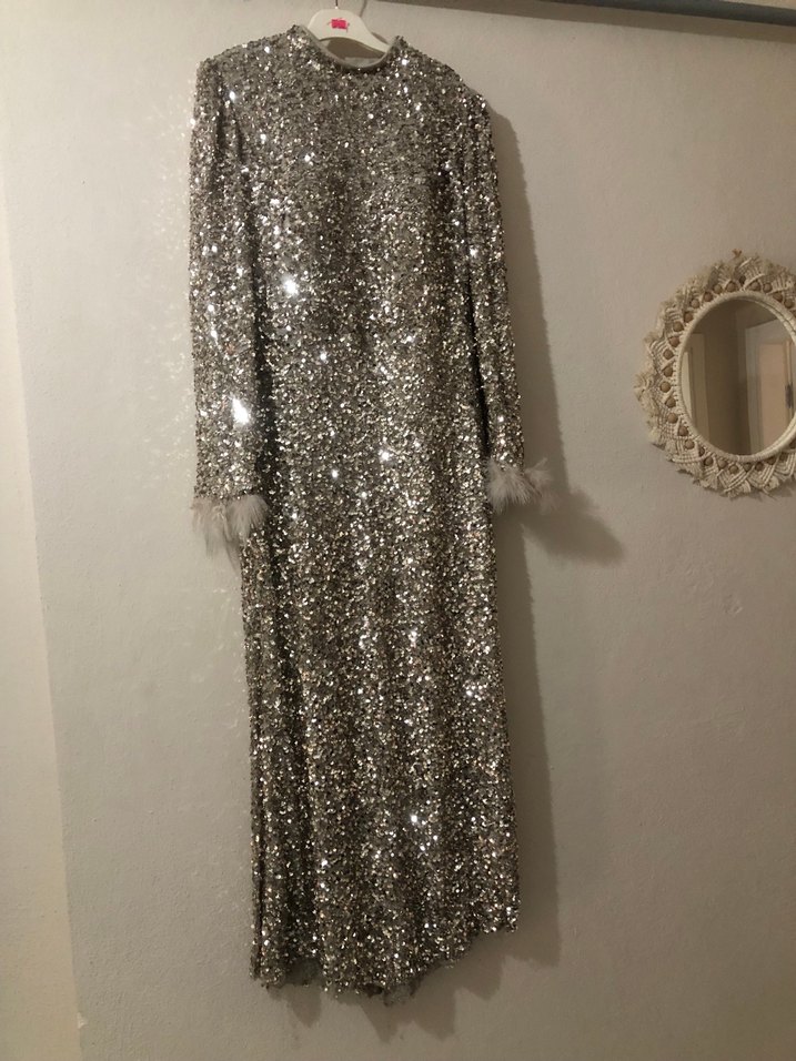 Bu uzun gri abiye elbise, bol kesim ve uzun kollu olup, yakasında yuvarlak kesim bulunur. Manşetlerde kürk detayları ve parlak, çağdaş bir tasarıma sahiptir çantası fiyata dahil değildir …. ✨