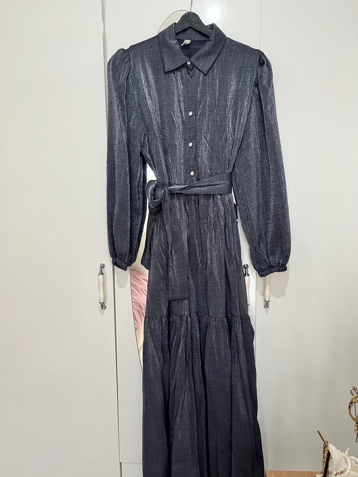 Gri renkte, yakalı ve uzun kollu, kuşaklı uzun elbise. Yumuşak sentetik kumaştan üretilmiş, regular kalıp ve hafif batik desenlidir. Ofis ve günlük şehir stiline uygun.