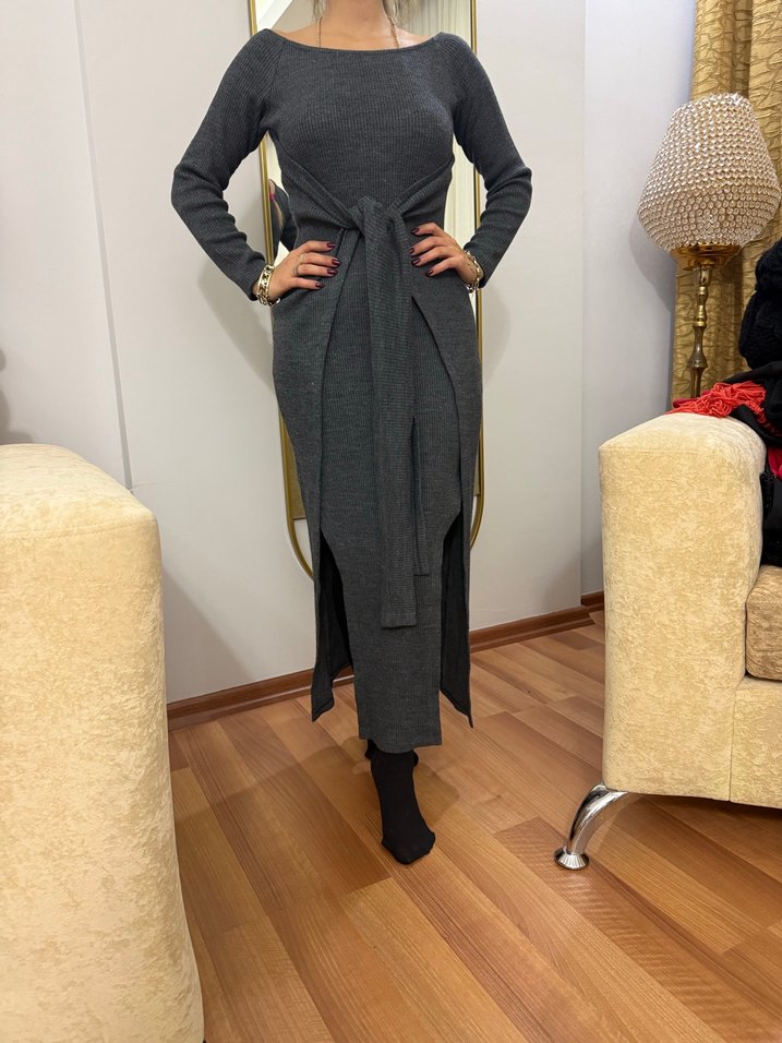 Gri renkte, yün kumaştan yapılmış uzun elbise, tekne yaka ve kuşaklı bel detayıyla trend bir görünüm sunar. Günlük kullanıma uygundur. İster şık İster spor kombinlenebilir kurtarıcı giy çık bir parça