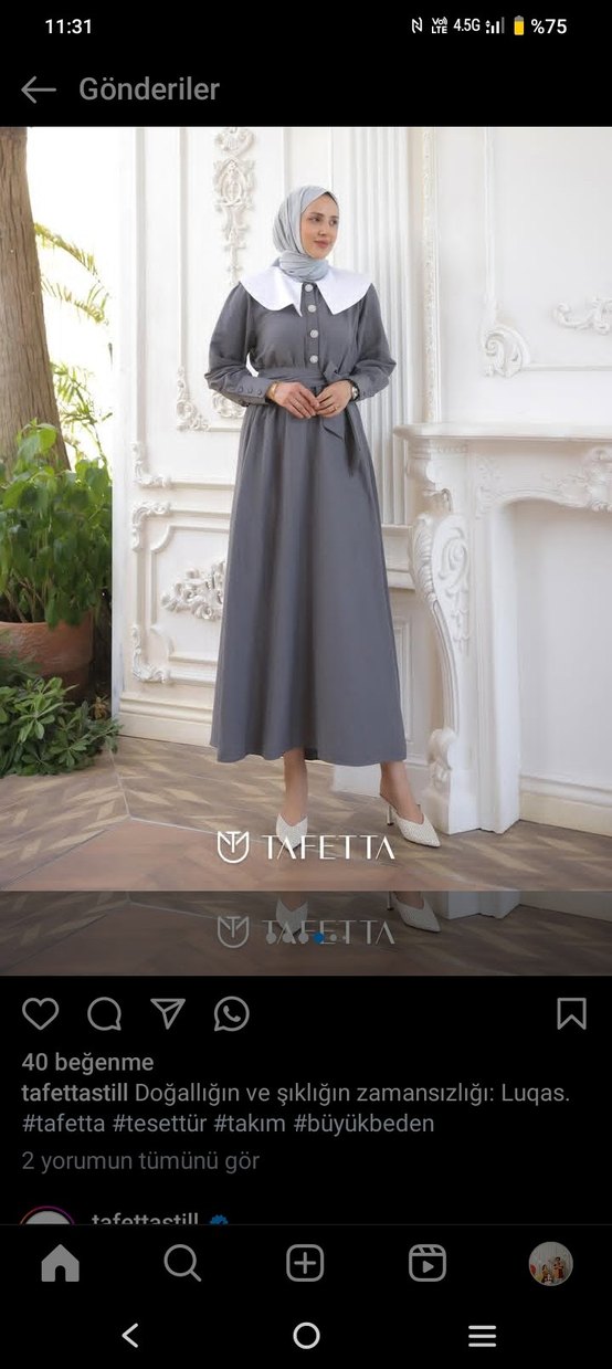 Gri renkte, uzun kollu ve yüksek yakalı, kuşaklı, bol kesim kadın elbisesidir. İpeksi dokusuyla modern klasik minimalist tarz sunar. Günlük kullanıma uygundur.