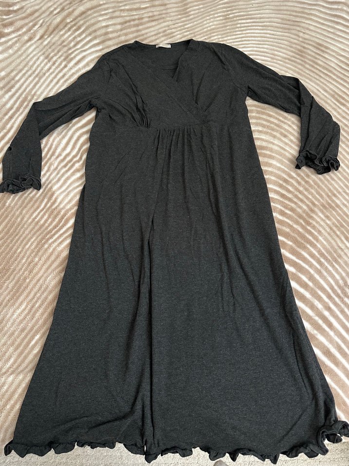 Uzun boy, bol kesim ve uzun kollu gri. V yaka ve düz renk ile rahat kullanım sağlar. Emzirme kolaylığı var. Doğum sonrası hastane için kullandım.
