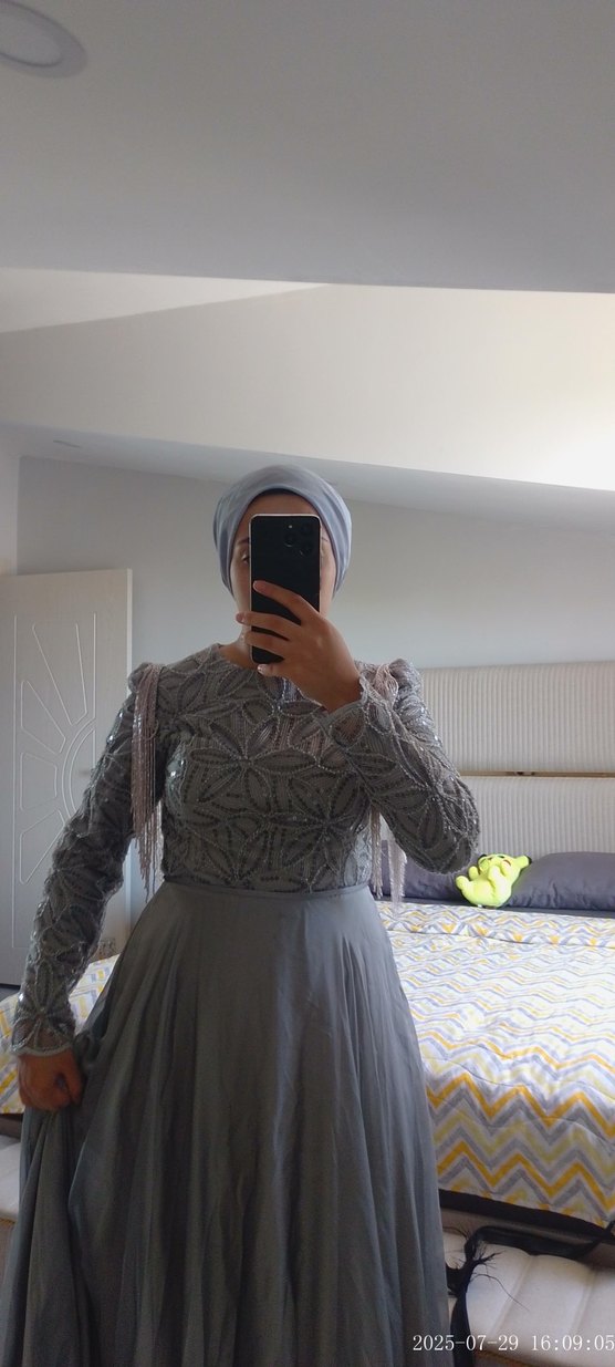Bu gri midi elbise, uzun kollu ve yüksek yakalıdır. Drapeli detaylara sahip, sade ve mütevazı bir tasarımdır. Günlük kullanıma uygundur.