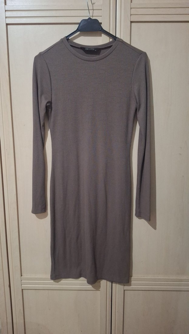 Düz gri renkte, uzun kollu ve bisiklet yaka, vücuda oturan mini elbise. Minimalist ve günlük kullanıma uygun.