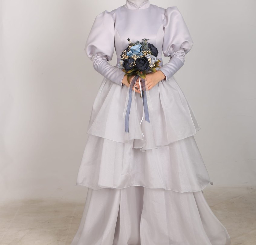 Gri renkte, yüksek yakalı ve uzun kollu, düzenli kesime sahip nişan elbisesi. Drapeli katmanları ve hafif floral deseniyle modern klasik şıklık sunar.