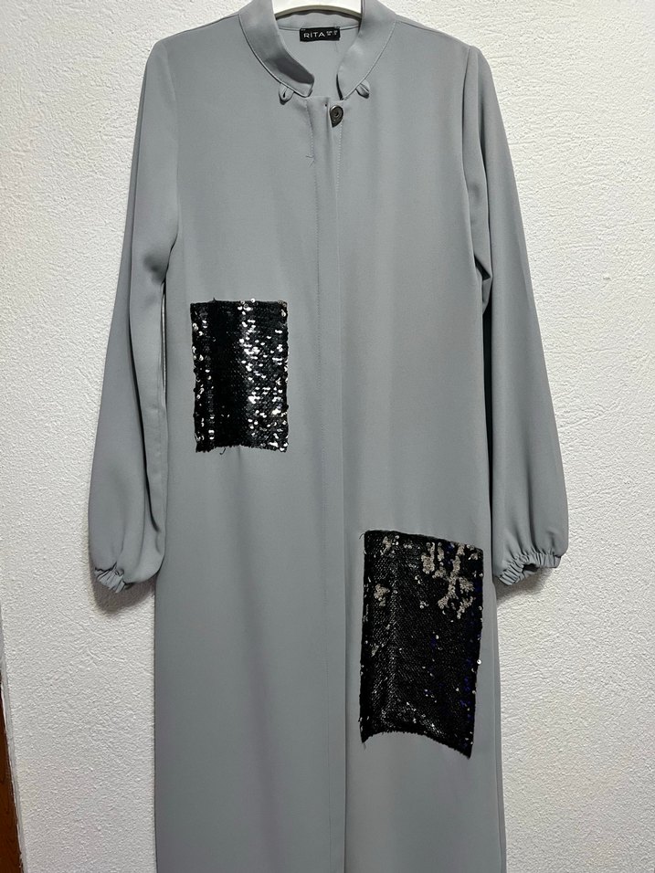 Kadınlar için uzun, bol kesim gri tunik. Yaka tipi notlu, düğmeli ön kısım ve nakış detaylıdır. Siyah payetli parçalarla sokak stilini yansıtır. Uzun kolları lastikli manşetlidir. Günlük rahat kullanım için uygundur. ✨