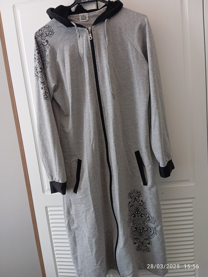 kadın uzun gri hırka, uzun kollu ve şık kesimdir. Kol ve alt kısımda siyah nakışlar bulunur, kapüşonlu ve ön fermuarlıdır.