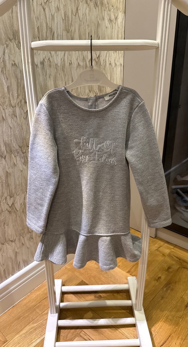 Gri renk uzun kollu, yuvarlak yakalı kız elbisesi yumuşak ve sıcak kumaştan üretilmiştir. Nakış detayları ve fırfırlı etek ucu ile tarz katıyor.