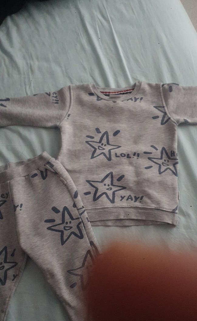 Gri renkte, uzun kollu ve bisiklet yaka örgü kumaştan yapılmış erkek bebek takımı. Üzerinde yıldız ve 'yAy!' yazılı baskılar bulunur, sokak tarzı için uygundur.