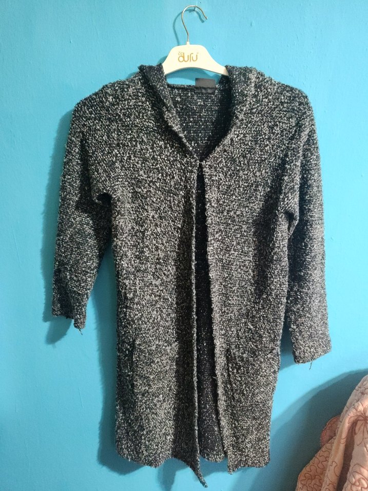 Gri renk, uzun kollu, örgü yün hırka, kesik yaka ve bol kesim ile rahat sokak stili sunar. Günlük kullanım için uygundur.