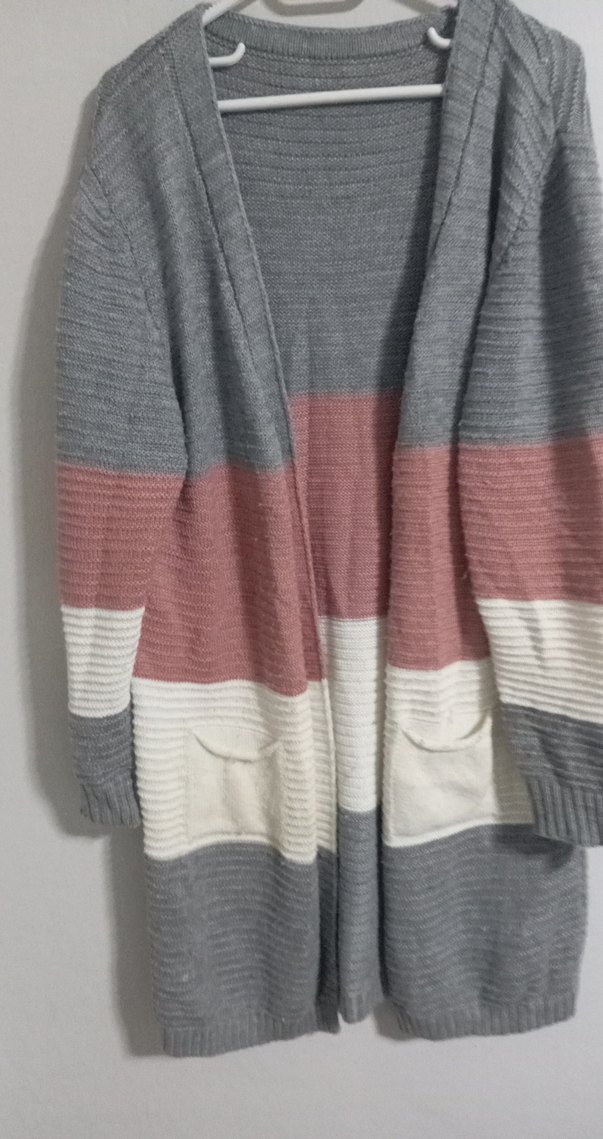 Gri, pembe ve beyaz çizgili, uzun ve bol kesim örgü hırka. Notlu yaka tasarımıyla günlük kullanıma uygun, rahat bir stil sunar.