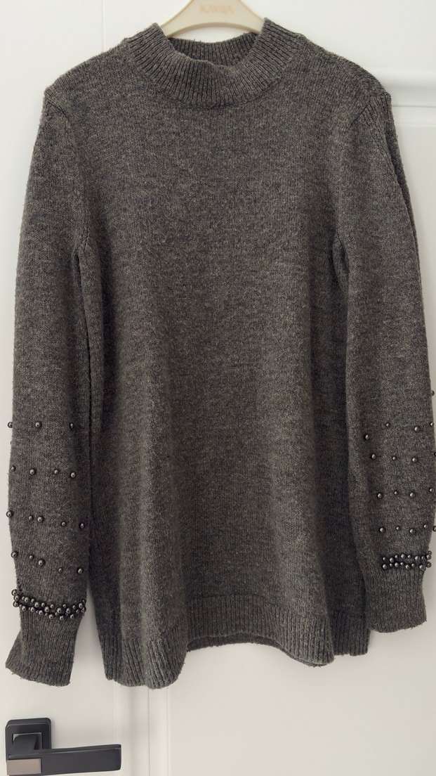 Gri renkli, yuvarlak yaka ve boncuk detaylı uzun kollu örgü kadın kazak. Rahat kesimi ve uzun boyu ile konforlu bir stil sunar.