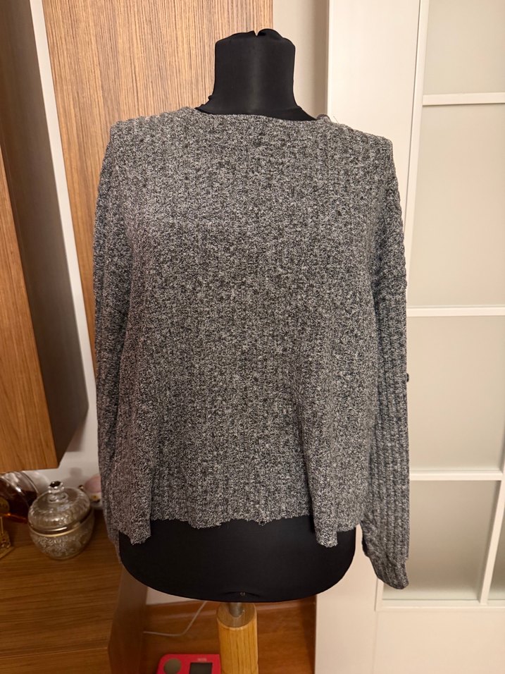 Gri renkli, yuvarlak yakalı ve uzun kollu örgü kadın kazak. Normal boyda, rahat kesim ve sade tasarımıyla günlük kullanıma uygundur.