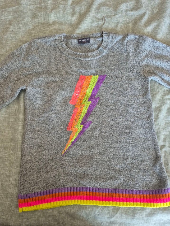 Gri renkli, uzun kollu ve yuvarlak yakalı örgü kadın kazak. Önde renkli yıldırım baskısı ve canlı renkli çizgili etek ucu bulunur. Salaş kesim, dış mekan kullanımı için uygundur. ⚡