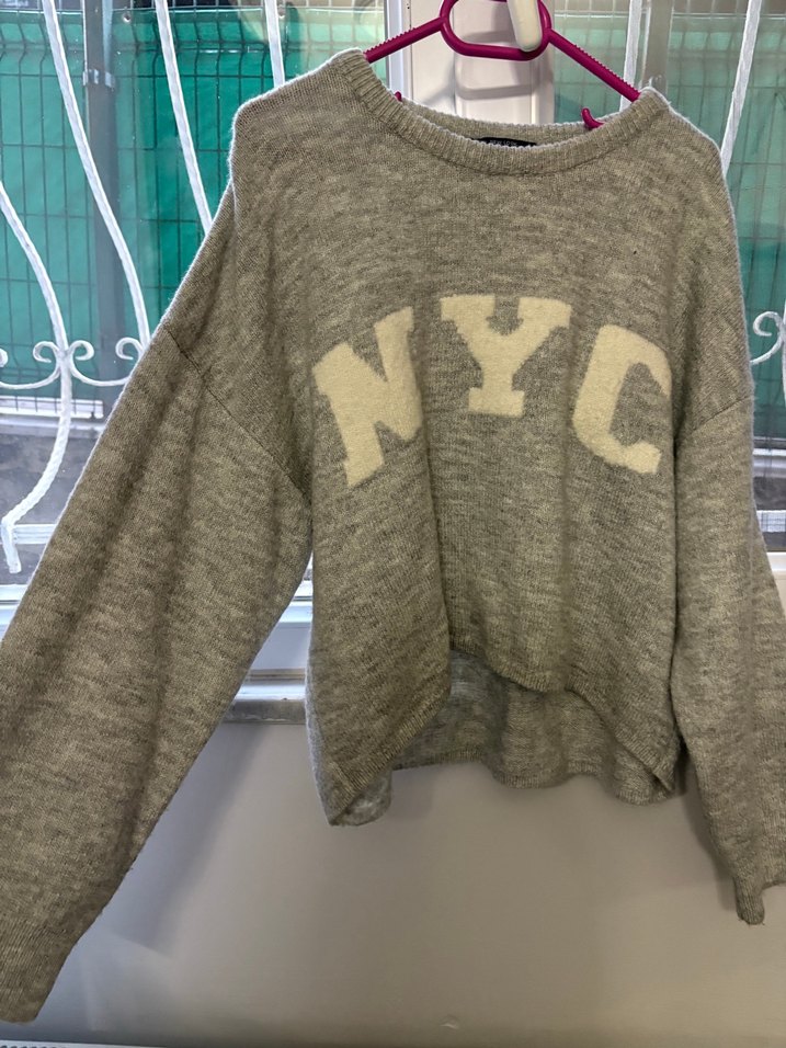 Önünde 'NYC' baskısı olan gri örgü kazak, uzun kollu ve yuvarlak yaka. Rahat kesimi ve normal boyuyla günlük sokak stiline uygun yetikinlerede olur