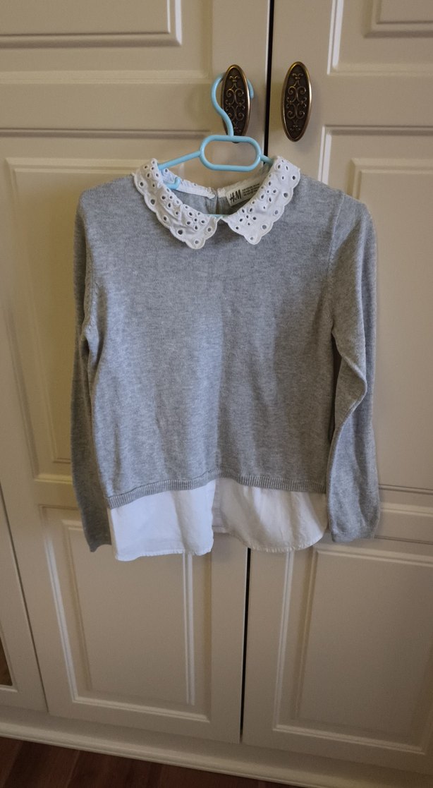 Gri renkli, dantel detaylı yakası ve katmanlı etek ucu tasarımı olan örgü triko. Uzun kollu ve bol kesim, günlük kullanıma uygun.