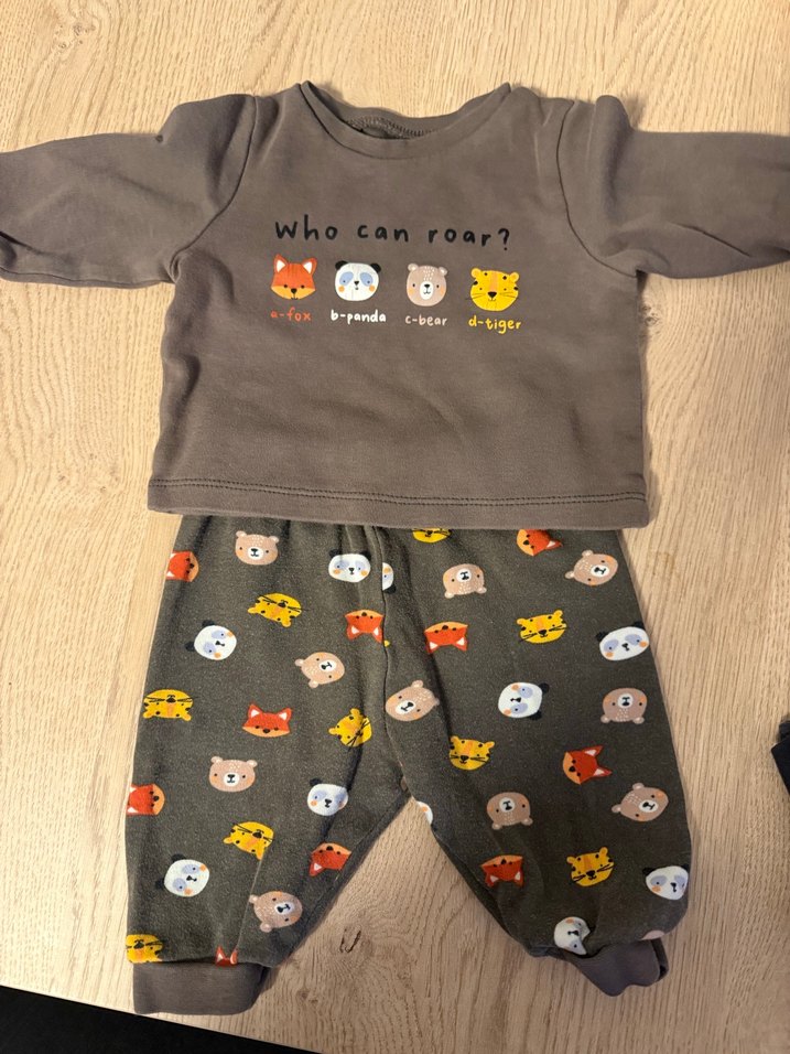 Gri uzun kollu örme üst ve hayvan desenli pantolondan oluşan bebek takımı. Üstünde "Who can roar?" yazısı ve sevimli hayvan yüzleri bulunur.