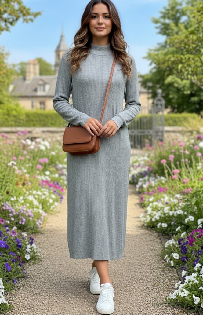 Gri Uzun Kollu Örme Kadın Elbise